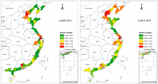 To delve deeper into the local dynamic evolution of the coastal tourism economy in China, this paper employs the LISA spatiotemporal analysis to examine the geometric characteristics of the tourism economy’s trajectory. Simultaneously, the method of natural breakpoints is utilized to categorize relative lengths and curvatures into five levels: high, higher, medium, lower, and low. Regarding the research intervals, 2014 serves as the dividing point, splitting the entire research period into two equal time spans: 2009–2014 and 2014–2019. Equations (2) and (3) are applied to calculate relative lengths and curvatures for comparative analysis between the pre- and post-2014 stages.
