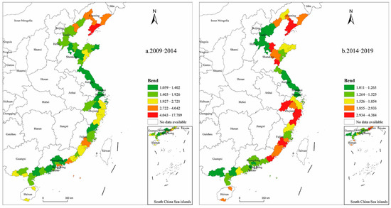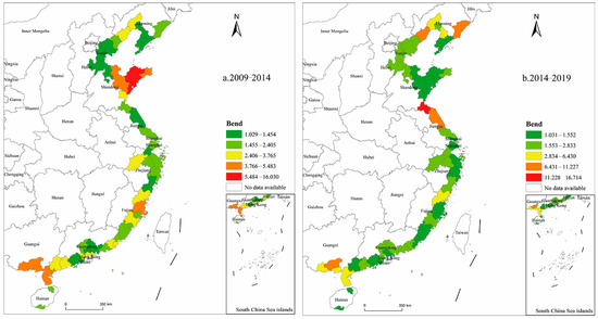 Cities with high-level curvature during 2009–2014 include Qingdao (16.030) and Yantai (9.965), with 8 cities exhibiting higher-grade curvatures, primarily concentrated in Guangxi Zhuang Autonomous Region and Shandong Province. In the period of 2014–2019, cities with high-grade curvatures include Lianyungang City (16.714), while those in higher grades are Huludao City (11.226), Dandong City (8.524), Qinzhou City (7.238), and Yancheng City (7.129).