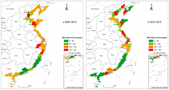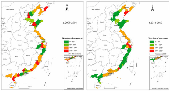 By examining the position of the domestic and international tourism economies of each coastal city in 2009, 2014, and 2019 on the Moran scatterplot, we analyze their stage-wise movement directions and classify them into four types: (1) 0–90° (high-high type): this indicates positive synergistic growth of the tourism economy of the study city and its neighboring cities; (2) 90–180° (low-high type): this signifies positive synergistic growth of the tourism economy of the study city with low growth while neighboring cities exhibit high growth; (3) 180–270° (low–low type): this denotes negative synergistic growth of the tourism economy of the study city and neighboring cities; (4) 270–360° (high-low type): this reveals the high growth of the study city and the low growth of neighboring cities.