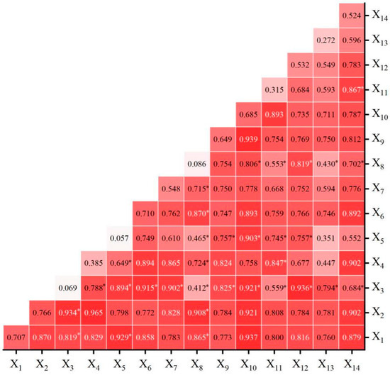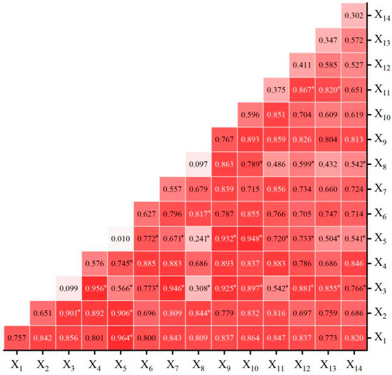 In the context of the domestic tourism economy (Figure 8), the interaction of each influencing factor with others yields a substantial impact, with 95.60% of the factor interaction explanatory power exceeding 0.5. This underscores the significant influence of these interactions on the development of the domestic tourism economy in coastal cities. Notably, nonlinear enhancement predominantly characterizes the interaction between X3 (green space per capita), X5 (coastline coefficient), and X8 (intra-regional highway network density), and their respective factors. Despite not passing the significance test at the 0.05 level and having q-values below 0.1—indicating weaker explanatory power for the domestic tourism economy individually—these factors exhibit the most pronounced growth in explanatory power during interaction detection. This suggests that while their influence as single factors may be modest, their collaborative effect with multiple factors amplifies their economic driving force on domestic tourism.