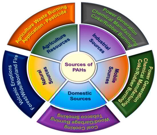 Natural PAH pollution comes from the incomplete combustion of organic substances, biomass, and some fossil fuels [,] from industrial, mining, and agricultural activities []. This pollution can cause negative effects on living organisms [,].