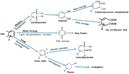 Bacterial and fungal biodegradation pathways of PAHs (adapted from []).