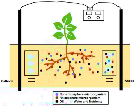 Through electrokinetic bioremediation, the degradation of organic pollutants in the soil was improved []. After electrokinetic bioremediation, over 40% of PAHs were removed []. Figure 3 shows electrokinetic bioremediation. The movement of the acid in the approach of the anode to the soil pores is favored by the action of the low-intensity direct current, breaking the connection between the pollutants and the soil. Through electroosmosis, nutrients and water migrate into the soil, the diffusion of pollutants is increased, and the total amount and microbial activity increase, thus facilitating the migration of microorganisms from rhizosphere soil to non-rhizosphere soil, and the pollutant elimination rate is improved.