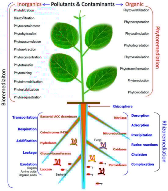Within phytoremediation, the transformation and degradation of PAH are carried out by plant species through the secretion into the soil of enzymes such as hydrolase, dehydrogenase, monooxygenase, dehalogenase, dioxygenase, and peroxidase [].