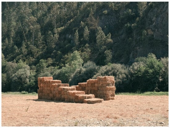 Conversely, with its more constrained timeframe, Fertile Futures embodies a curatorial practice that sows the seeds of new possibilities, fostering a space for reflection and critical engagement where future social and environmental transformations can be actively and radically reimagined. The curatorship begins with a proactive, activist proposal to overcome the ephemerality of the Biennial exhibition in a laboratory of horizontal learning and un-learning. Specifically, the “temporary displacement” [] (p. 23) of architecture students from all continents to Fundão aims to establish new dialogues with a non-colonial, horizontal approach between new generations, the teams, and the local population. Over fifteen days, the teams spread over the vast area of the small villages of Fundão, contributed to the swift development of interventions, each addressing a specific issue related to the degradation of the land. They were all asked to develop the research for the exhibition; however, each team responded differently. Corpo Atelier, for example, proposed to depart from the general line with Beatriz, “an architectural artefact of sensorial experience”, as Filipe Paixão states. By creating two parallel and opposing staircases of hay bales near the Zêzere River, they opted to create a listening tool for the pure enjoyment of the present, experiencing the touch, sounds, and smells of the anthropic and natural elements that surround the area (Figure 5). On the other hand, Space Transcribers maintained the playful approach of their exhibition in Auto da Barca de Janeiro de Cima. Using a “non-conventional architectural methodology”, as Daniel Duarte Pereira asserts, they proposed storytelling about fabulations of the future intertwined with ancestral legends shared by the community, to imagine stories of a Fundão without water. Ponto Atelier had the opportunity to work in an old monastery and refugee centre. Fo(u)r is the title of the intervention in which the four corners of the monastery’s cloister gave rise to a square fountain created “for”7 its community, representing four different nationalities, religions, and cultures (Figure 4). All the interventions bring art closer to the local community, demystifying its production and enabling a direct, tactile connection through everyday, perishable materials that incorporate the tactic of defetishising art and heritage. At the same time, the findings illustrate a form of resistance to productivist time [], reflecting Johnston’s [] reflexive approach to curatorial practice that values depth, duration, and community engagement.