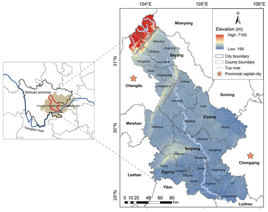 The Tuo River, located in the east-central Sichuan Province of China, has its source in Qingping Town, Mianzhu City. It flows in southeast for about 638 km through an area of approximately 32,900 km2. The geographical coordinates of the area are 103°38′~105°50′ E and 27°50′~31°41′ N. The river flows through seven large and medium-sized cities, including Deyang, Chengdu, Ziyang, Meishan, Neijiang, Zigong, and Luzhou City. In accordance with the Overall Program in TRB [28] and based on the principle that the watershed area exceeds 70% of the total administrative area, 27 counties from seven large and medium-sized cities were selected for this study (Figure 1).