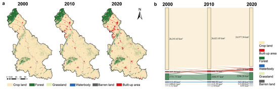 Land use/land cover in the TRB: (a) Land use/land cover in 2000, 2010, and 2020; (b) Land use/land cover conversion from 2000 to 2020.