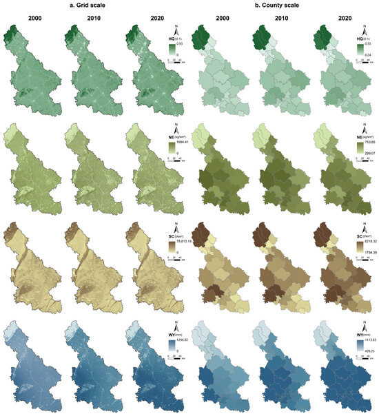 The spatio-temporal distribution of ESs at different scales in 2000, 2010, and 2020: (a) at the grid scale; (b) at the county scale.