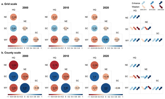 Correlations among ES pairs and correlation changes at both scales: (a) grid scale from 2000 to 2020; (b) county scale from 2000 to 2020. (* means p < 0.1; *** means p < 0.01).
