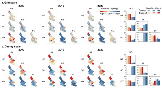 At the grid scale, the spatial synergy was more pronounced than the spatial trade-off for HQ–SC, NE–SC, and NE–WY pairs. The NE–WY pair exhibited the greatest spatial synergy proportion, approaching 100%. At the same time, the average spatial synergy proportions of the HQ–SC and NE–SC pairs were 62.58% and 68.02%, respectively. Conversely, the HQ–NE, HQ–WY, and SC–WY pairs had lower spatial synergy ratios than spatial trade-off proportions, with average spatial synergy ratios of 33.23%, 24.20%, and 34.13%, exhibiting spatial trade-off characteristics. Contrasting with the findings observed at the grid scale, ES pairs including HQ–SC, NE–WY, and SC–WY predominantly showed spatial synergies, except for the SC–WY pair, while the spatial synergy ratios of the other two ES pairs approached 100%. In contrast, the HQ–NE, HQ–WY, and NE–WY pairs exhibited characteristics of spatial trade-offs, with average spatial synergy ratios amounting to 12.69%, 42.21%, and 18.45%, respectively. From 2000 to 2020, the majority of ES pairs exhibited an overall increasing trend in synergy areas at both scales.