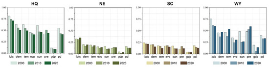 According to the interaction detector results (Figure 8), the interaction between driving factors generally exhibited an enhancement effect, primarily as a two-factor enhancement. This indicates that factor interactions are crucial for understanding the spatial variance in ESs within the study area. The interplay between LULC and other variables, particularly ecological factors, was substantial. For HQ, the combined explanatory power derived from the interaction of the LULC with other factors is above 80%. Furthermore, the interaction influences of the LULC and PRE were particularly prominent for WY, with an explanatory power of around 90%.