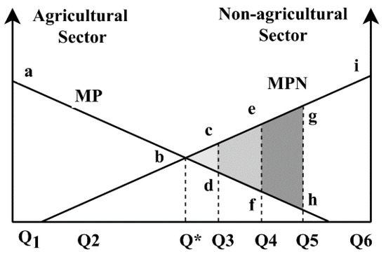 Land use regulation in territorial spaces affects the allocation of land resources [26], leading to the issues of “windfall losses” and “windfall profits” [27]. As shown in Figure 1, based on the “rational actor hypothesis” and only considering economic returns, the allocation of land between the agricultural and non-agricultural sectors is determined by the market according to marginal costs and marginal benefits. Equilibrium is reached at point b in this Figure, where the combined returns of the land resources in the agricultural and non-agricultural sectors are represented by . However, to ensure national food security and ecological safety, a larger portion of land resources needs to remain within the agricultural sector. Based on the theory of equitable burden-sharing, such burdens aimed at serving the public interest should be borne equally by all regions. At point in the Figure, the flow of land resources into the agricultural sector may be restricted. In this scenario, the combined returns of the land resources in both sectors across regions would be , resulting in a loss of land resource returns amounting to for all regions. Nevertheless, under land use regulation, territorial spaces are artificially divided into restricted development areas and non-restricted development areas [28]. Restricted development areas bear a greater responsibility for ensuring food security and ecological safety. Consequently, their land development rights are suppressed, and the flow of land resources may be controlled as early as point . At this point, the returns for regions within the restricted areas amount to , leading to a loss of land resource returns of compared to when the burden is equally shared among all regions, resulting in windfall losses for these areas. Ultimately, this leads to the “windfall losses–windfall profits” dilemma under land use regulation [29], exacerbating regional development imbalances.