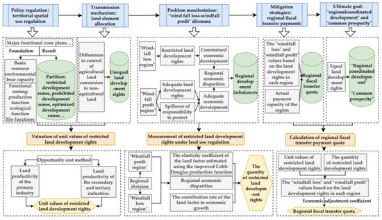 Regional fiscal transfer payments are an important tool for addressing the “windfall losses–windfall profits” dilemma under land use regulation. Compared to “windfall profit regions”, “windfall loss regions” lose equal development opportunities due to restricted land development rights, often resulting in lagging economic development. At the same time, these regions bear a greater responsibility for food security and ecological safety. Burdens imposed for the sake of public interest that cause individuals to make particular sacrifices should be addressed with compensatory care under public law [30]. Consequently, restricted areas deserve to receive compensation. Through regional fiscal transfer payments, “windfall loss regions” can be compensated for the “windfall profits” gained by “windfall profit regions” from land development rights to offset their “windfall losses” of land revenue due to restrictions. This approach ensures that both regions attain equal land development rights, promoting balanced regional land development. This strategy lays a foundation for advancing coordinated regional development and achieving common prosperity, as illustrated in Figure 2.