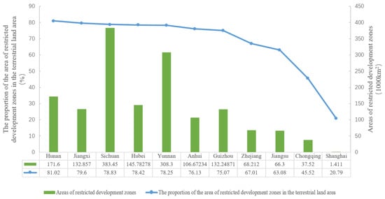 To measure the regional economic losses caused by restricted land development rights, this study assessed the extent of land development restrictions based on the percentage of restricted development areas relative to the total land area in each province or city. The restricted status of the land development rights in the 11 provinces and municipalities within the Yangtze River Economic Belt is shown in Figure 4.