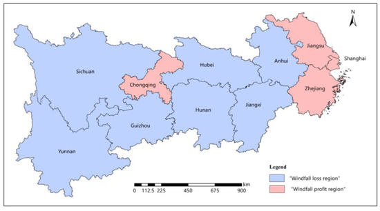The final classification results are presented in Figure 5. The “windfall loss regions” included seven provinces: Anhui, Hunan, Hubei, Guizhou, Jiangxi, Yunnan, and Sichuan. The “windfall profit regions” included four provinces and cities: Shanghai, Chongqing, Jiangsu, and Zhejiang.
