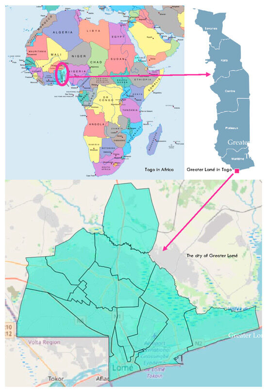 This study is based in Greater Lomé, a district of 425.6 km2, which is Togo’s capital and most populous metropolis (Figure 1). This major city is located in the country’s southwestern region, bordering Ghana, and stretching along the coastline of the Gulf of Guinea. Greater Lomé is composed of 13 municipalities. In 2020, its population was estimated at 2,362,366, representing a density of around 7000 inhabitants per km2 and 24% of the national population, compared with 1,571,508 in 2010, according to the 2010 General Census of Population and Housing. Recognized as the administrative, economic, and commercial heart of Togo, Greater Lomé also plays a crucial role as a key seaport in West Africa. The city is distinguished by its vibrant market, offering a captivating mix of colonial and contemporary architecture, complemented by wide palm-shaded avenues and easily accessible beaches. Despite urban development and economic expansion challenges, Greater Lomé stands out for its dynamism and hospitality, embodying Togo’s diversity and cultural richness.