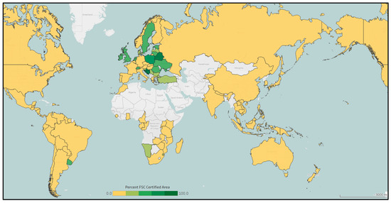 Global distribution of areas certified with Forest Stewardship Council’s (FSC) forest management (FM) certification as a percentage of total forest area in a country in the year 2020 [10]. Countries with no color did not have any FSC-FM certification in 2020.
