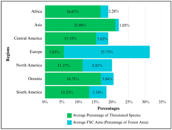 Average percentage of threatened species and Forest Stewardship Council (FSC) forest management (FM) certified area (as % of forest area) from 2008 to 2019 across different global regions, covering 91 countries with existing FSC FM certifications.
