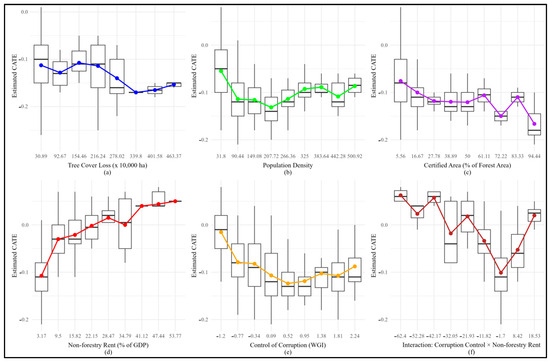 By explicitly considering the confounding effects of these variables, we gain a clearer understanding of the association between FSC-FM presence and biodiversity conservation. Figure 3 displays the distribution of conditional average treatment effects (CATEs), along independently taken covariates that were statistically significant (p < 0.05). This analysis reveals that confounding variables can potentially influence the direction and magnitude of the relationship between FSC certification and biodiversity outcomes. It suggests that the actual association of FSC certification with biodiversity may be masked or distorted without adequately accounting for these confounding factors. Table 4 complements the analysis by presenting the estimates and robust standard errors for modifications in the association between FSC certification presence and biodiversity. The results demonstrate that the association of FSC certification with biodiversity is positive in the context of a higher percentage of FSC-FM-certified areas and higher tree cover loss. However, the association becomes negative when non-forestry rent and its interaction with the perception of corruption control increase, indicating the potential negative impact of poorly managed resource extraction and corruption on biodiversity outcomes.
