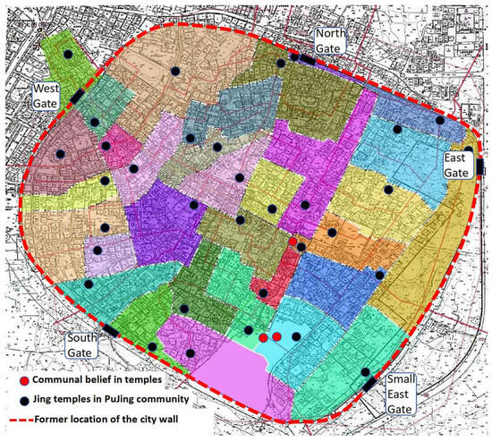 Distribution of Pujing boundaries and Jing temples in the Yongning Ancient Acropolis (image source: [50]).