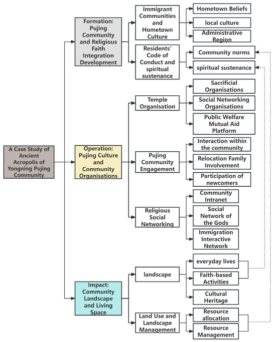 The evolution of traditional settlements depends on the availability of community capital, and economic capital is a key factor in community development. In recent years, the promotion of rural revitalisation has led to a surge of interest in the industrial transformation and development of traditional settlements. The subject has attracted the attention of government agencies and researchers from a range of disciplines [5,16,34,74,75]. Moreover, the utilisation of policy, financial, and human resources to construct community infrastructure and undertake strategy analysis is intended to engender a conducive environment for industrial development and to curtail the community’s industrial transformation cycle. The strategy of using religious belief to promote the revitalisation of community industry in the Yongning Ancient Acropolis community is consistent with the point of view of [5,16], that is, the community builds a social network through religious beliefs activities to promote the construction of the social, economic, human, and cultural capital of the community [9,12]. The Pujing community serves as a case in point, which shows that faith-based activities have garnered the attention of officials and community organisations. Moreover, it demonstrates that community residents actively engage in faith-based activities, perceiving them as an integral component of their culture and daily life. These activities are also viewed as a means of fulfilling residents’ expectations and providing spiritual sustenance, contributing to an enhanced quality of life. It is evident that the utilisation of faith-based activities within Pujing communities functions as a conduit for community residents to engage with, interact with, and articulate their spiritual aspirations. This phenomenon could be explained in view of the interplay between the tangible daily life experiences of community residents and the social network, which endows them with authentic and substantial cultural heritage resources and political and human capital, thereby facilitating the transformation and development of community cultural and tourism industries [17,76].