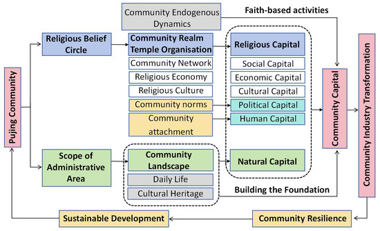In recent years, there has been a growing interest in community beliefs across a range of disciplines, particularly in the context of urban and rural studies. In ethnography, the continuity of settlement history was explored in terms of the intertwining of secular and religious belief activities within the context of the living space, the alternation of rituals and festive ceremonies within the rhythms of life, and the memory of remembrance and place [15]. In spatial terms, Lin et al. [34] indicated that the creation of space for residents’ daily lives appeared to transcend and transfer the scope of official administration. With regard to the institutional aspect, Chen [14] proposed that it was the evolution of the administrative system of the ancient Rihe community that served to unite the official institutional organisations and the civil society. From a socio-cultural standpoint, Ji [35] suggested that the integration of society and culture, which was divided into a supernatural defence circle and a community drawn by religious beliefs, was a key factor. With regard to rural revitalisation, Shen et al. [16] viewed the Pujing space as a platform and network for rural revitalisation and community development. In short, Pujing community was the result of the integration of clan culture, native religious beliefs, and the prolonged presence of Ming and Qing military households and local cultures in the WeiSuo, which finally led to the construction of a religious community with regional characteristics combined with the official administrative area. This paper posits that Pujing represents a kind of community capital, with the community leveraging the authority of the Pujing temple organisation to regulate a range of community activities, including land use, landscape patterns, infrastructure development, and residents’ daily behaviours. The overall effect is to enhance the community’s resilience. Finally, it is clear that community capital is established through religious beliefs and cultural landscapes that enhance community resilience. However, to date, there is limited research within the Pujing community that regards community capital as a form of resilience in community development.