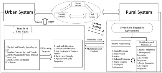 Researchers have identified that inadequate circulation of resources between urban and rural areas has led to various issues, including market segmentation and inefficient allocation of factors. The identified issues are fundamental to the imbalance in the economic and social frameworks of urban and rural regions, contributing to the intensification of duality. Land serves as the essential connection between urban and rural development, facilitating the seamless movement of resources between these areas. Reforming the rural land system is a fundamental catalyst for advancing integrated urban–rural development []. The transfer of rural land enhances land use efficiency [], which in turn increases farmers’ income [], reduces the urban–rural income gap [], promotes the convergence of factor returns, and facilitates the integrated development of urban and rural economies and production. The transfer of rural land has facilitated the development of the rural economy [], enhancing the equalisation of basic public services and promoting the integrated development of urban and rural social life. The transfer of rural land has significantly enhanced green total factor productivity [], thereby facilitating the integrated development of urban and rural ecological environments. Promoting the integrated development of urban and rural areas requires the establishment of an effective mechanism for the circulation of urban and rural factors and value enhancement. This involves facilitating a two-way flow and balanced sharing of these factors, ultimately leading to the creation of a comprehensive urban–rural integrated regional system that encompasses various dimensions, including economic, social, demographic, spatial, and ecological aspects [].