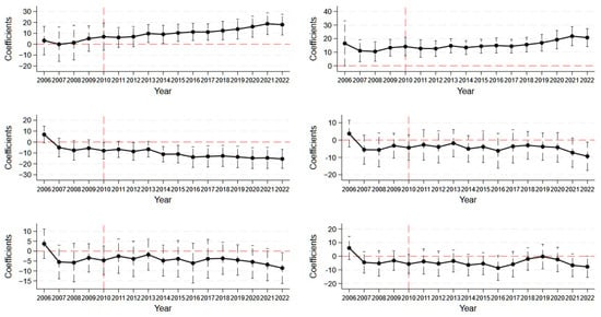 This paper analysed the impact of land transfer on urban–rural integrated development using a continuous Difference-in-Differences (DID) model to validate the efficacy of dual machine learning models in causal inference analysis. Table 7 presents a comparison of the regression outcomes of the dual machine learning model (DML) and the double difference model (DID) across various combinations of provincial effects, fixed effects, and control variables, while Figure 2 illustrates the results of the parallel trend test for the DID model corresponding to different scenario combinations.