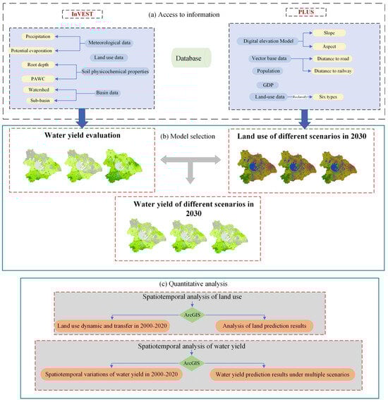 Regarding the WY services, the kinds and alterations of LULC directly influence the hydrological processes and WY of ecosystems, which in turn affect their general functioning and provision of services []. Different LULC activities, such as forestry, agriculture, and grasslands, significantly impact how precipitation is intercepted, infiltrated [], and runs off due to their varying types of vegetation cover and soil characteristics. Thus, it is essential to investigate the impact of LULC changes on the WY of ecosystems. To catch the LULC changes and their WY services, many LULC simulation models are implemented, including the Automaton (CA) model [,] the Conversion of LULC and its Effects at Small regional extent (CLUE-S) model [,], the Multi-Agent System (MAS) model (Yuan et al., 2014), and the Future LULC Simulation (FLUS) model [,]. These prediction models have mostly concentrated on enhancing modeling approaches, rules, and precision, while paying less attention to the fundamental factors that drive LULC and its changes over time []. Recently, Liang, et al. [] developed the PLUS model, integrating the Land Expansion Analysis Strategy (LEAS) and a Cellular Automaton model using multiple types of Random Seed Patches (CARS), which offers a comprehensive patch-level dynamic simulation and data mining capabilities for LULC. The PLUS model mimics patch-level variations in different LULC types more accurately and excavates the causes of LULC changes more thoroughly than previous models. In particular, adding LULC planning rules to the next multi-scenario simulation improves the realism and citation value of the findings [].