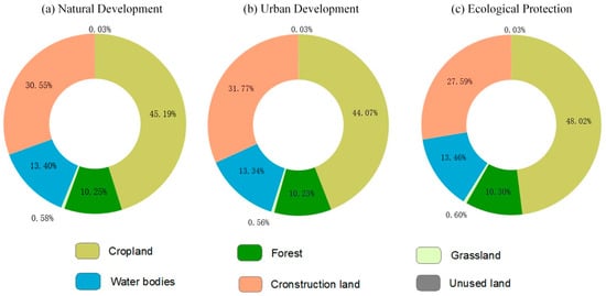UD—With the acceleration of urbanization, a large amount of cropland is gradually being replaced by urban construction, with the amount of cropland reduced by 2017.6 km2 compared to 2020. Construction land has expanded sharply, increasing by 21.43%. Industrial parks and commercial centers in the urban fringe areas continue to expand. Compared to the natural scenario, the forest area further decreases, while the growth rates of grassland and water bodies both decline, indicating a significant shift in the LULC structure.