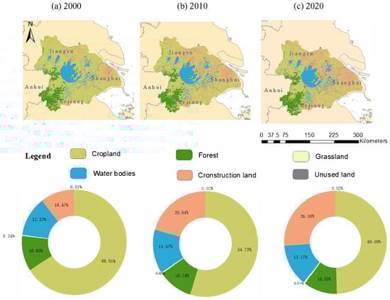 The predominant LULC types in the TLB are cropland and construction land (Figure 4). Cropland and construction land are extensively distributed across all regions except the southwestern hilly area, serving as the primary areas of human activity. Other areas mainly consist of forest and grassland, with forest occupying a significant proportion. In 2020, the LULC composition of the TLB was as follows: cropland (49.58%), construction land (26.16%), water bodies (13.16%), forest (10.54%), grassland (0.51%), and unused land (0.02%). The growth of construction land has resulted in a substantial reduction in the amount of cropland, while changes in forest and water bodies have been relatively minor. Unused land and construction land have shown evident expansion trends.