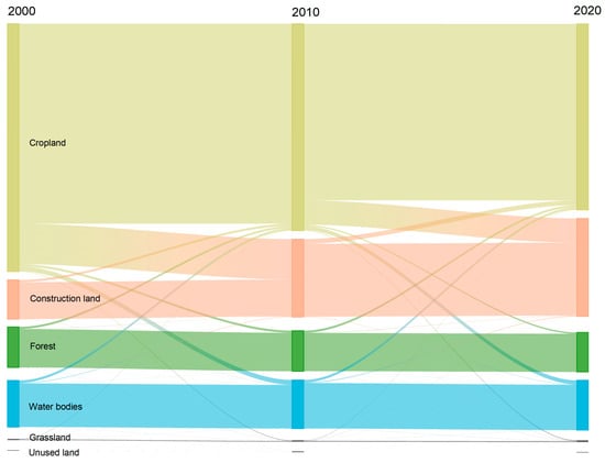 The total area of the TLB is 36,578 km2. The rapid and intensive process of urbanization has resulted in substantial alterations in LULC types between the years 2000 and 2020. The land transition Sankey diagram (Figure 5) illustrates that the transitions are primarily dominated by cropland and construction land. From 2000 to 2010, significant acreage of unused land was transformed into construction areas. From 2010 to 2020, some areas previously converted from cropland to non-agricultural uses reverted to agricultural production, indicating a partial recovery of cropland. However, a large portion was still converted to other land use types. Construction land continued to increase, though the growth rate slowed.