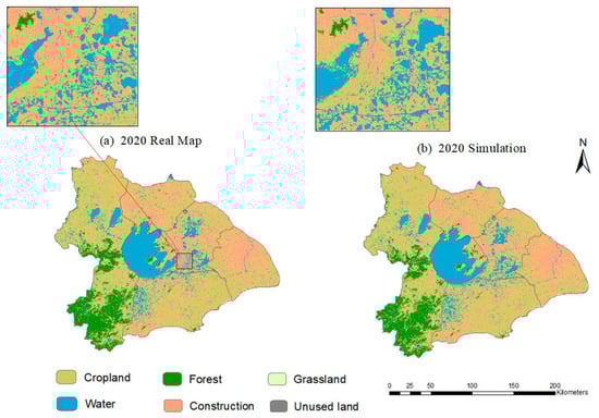 To evaluate whether the model’s simulation accuracy meets the research objectives, the LULC data from 2010 and 2015 were used as the baseline. Using the 2010 LULC data as the reference, the computed transition probabilities were applied to the PLUS model to predict the simulated LULC for 2020. The comparison results presented in Figure 6 and Table 6 show that the simulation accuracy is high, with minimal discrepancies from the observed values. The overall accuracy is 0.9522, and the Kappa coefficient is 0.9268, indicating a high level of reliability in predicting LULC changes. This suggests that the model fulfills the requirements for further study.