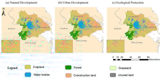 From 2000 to 2020, significant changes in LULC were observed, with cropland and built-up areas being the most prominent []. The expansion of construction land that encroaches on agricultural land, particularly in hilly and urban areas, will persist as a significant characteristic of future LULC changes without intervention. The formation of and changes in LULC are significantly influenced by policies and regulations, directly affecting future developments. In accordance with the goals and specifications outlined in the “Comprehensive Planning for the Taihu Basin (2012–2030)”, we have produced UD and EP scenarios. The study discovered that various policy orientations and development goals have substantial influences on LULC, as well as the trends of LULC transformation. More precisely, the simulation of the LULC in 2030 showed that cropland and construction land exhibit a more pronounced response to these policy changes, which is similar to the finding in the Upper Bhima River Basin [].