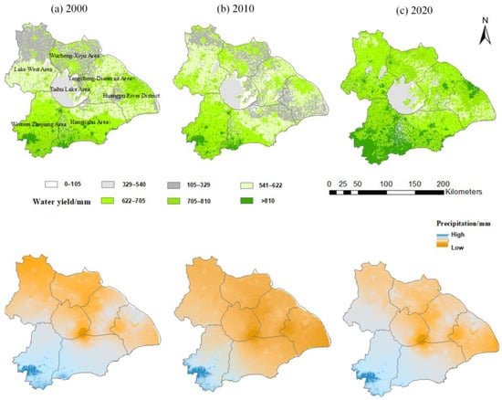 The WY in 2010 decreased compared to 2000, which is a comprehensive reflection of the direct impacts of climate factors and LULC factors. Due to the reduction in precipitation and the rise in average annual temperature (approximately 0.05 °C per year), the evapotranspiration rate in the watershed continuously increased. The evaporation from construction land was limited only by atmospheric conditions and was more sensitive to rising temperatures during the study period, which is one of the factors contributing to the decline in WY compared to the year 2000.