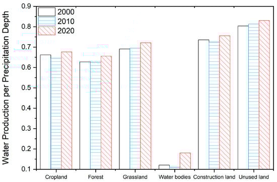 Based on the principles of the InVEST model, the WY of a grid cell is primarily influenced by precipitation and evapotranspiration. Due to varying evapotranspiration capacities across different land use types and differences in litter water retention and canopy interception among these categories, changes in land use directly impact water production []. To compare the WY efficiency of different land use types under the same precipitation conditions and to eliminate the impact of precipitation on WY, we divided the total WY of each land use type by the total precipitation, yielding the WY efficiency for each land use type.