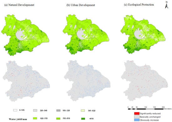 The evaluation of the 2030 LULC simulation for the TLB reveals an increase in WY across all three scenarios. Among them, the UD scenario exhibits the highest WY, while the EP scenario shows the lowest WY. From a methodological perspective, the water yield module of the InVEST model is based on the Budyko water–heat coupling balance assumption, in which evapotranspiration is considered as water loss. In general, precipitation is strongly correlated with actual evapotranspiration and potential evapotranspiration, which can be regarded as direct driving factors of WY. This study investigates the dynamic changes in ecosystem WY in three planning scenarios under the given climatic conditions, and the relative changes in WY in 2030 between three scenarios reach 5.2 × 108 m3. In the EP scenario, WY significantly decreases compared to the other two scenarios, with the highest WY observed under the UD scenario. The spatial growth pattern of construction land coincides with the areas exhibiting significant increases in WY, suggesting that socio-economic factors and urbanization also influence WY.