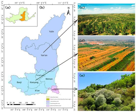 (a) Yellow River Basin region and Shaanxi Province; (b) the locations and ranges of the Loess Plateau region in northern Shaanxi, the Guanzhong Plain region, and the Qinba Mountain region; and (c–e) the typical vegetation landscapes in the different regions.