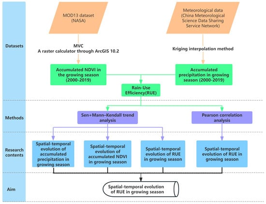 In this study, the NDVI bands in the MOD13 dataset were used, which were obtained from the NASA website with a spatial resolution of 250 m and a temporal resolution of 16 d for June to September in every year from 2000 to 2019. The Maximum Value Composite (MVC) method was used to obtain the monthly maximum NDVI data for the growing season (from June to September) from 2000 to 2019 to effectively remove the effects generated by the clouds, atmosphere, and solar altitude angle. The accumulated NDVI data for the growing season were obtained by accumulated processing using a raster calculator through ArcGIS software (ArcGIS 10.2, Environmental Systems Research Institute, Redlands, CA, USA). The methodology flowchart of this study is shown in Figure 2.