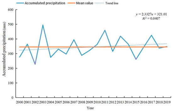 Figure 3 shows the interannual variation of accumulated precipitation in the growing season in the Shaanxi section of the Yellow River Basin from 2000 to 2019. The accumulated precipitation in the growing season fluctuated over time, with a weak upward trend. The highest value of the accumulated precipitation occurred in 2003, which was 496.16 mm, and the lowest value occurred in 2002, which was 227.61 mm, with an annual average rainfall of 348.32 mm in the period of 2000–2019.