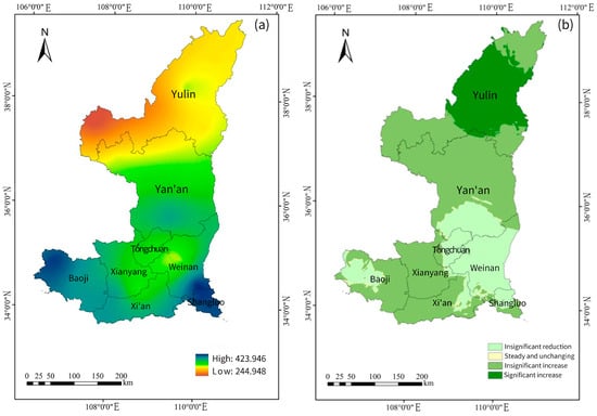 Figure 4 shows the spatial distribution of the annual mean accumulated precipitation and the variation trend of accumulated precipitation in the growing season in the Shaanxi section of the Yellow River Basin during 2000–2019. The spatial distribution pattern of precipitation in the whole area was more in the south and less in the north. The precipitation was the lowest overall in Yulin City in northern Shaanxi Province, which is located in the center of the Loess Plateau. However, it was found that the areas with significant increases in precipitation were mainly distributed in Yulin City, which accounted for 17.28% of the total area. Meanwhile, most of Yan’an City, Xianyang, Xi’an, and the eastern part of Baoji City had an insignificant increase in precipitation, which accounted for 60.28% of the total area of the study area (Table 1). There were no areas in the study area where significant decreases in precipitation occurred.