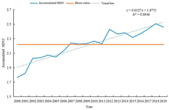 Interannual variation of accumulated NDVI in the growing season of the study area.