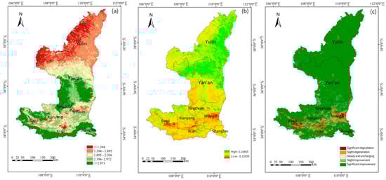 Figure 6c shows the spatial distribution of the variation trend of the accumulated NDVI in the study area. The vegetation cover condition in the study area improved overall from 2000 to 2019. The areas with improved vegetation cover were much larger than those with degraded vegetation cover and accounted for 93.50% of the total area of the study area (Table 2). The areas with significantly improved vegetation cover were mainly concentrated in the Yulin and Yan’an areas and accounted for 83.44% of the total area of the study area. The degradation of vegetation cover occurred in the dense urban areas in Guanzhong Plain and accounted for 6.09% of the total area of the study area.