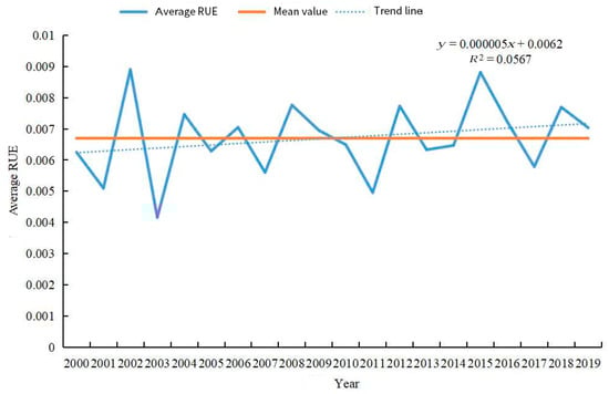 3.3. Characteristics of the Spatial and Temporal Evolutions of the RUE in the Shaanxi Section of the Yellow River Basin from 2000 to 2019