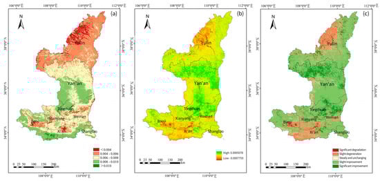 Figure 6b shows the spatial distribution of the change slope of the accumulated NDVI in the growing season of the study area. In the northern part of Yulin and Yan’an, the change slope of the accumulated NDVI was greater compared with those in other regions, indicating that the vegetation cover improved rapidly in these areas. In the southern part of Yan’an City, the change slope of the accumulated NDVI was positive and relatively low, indicating that the vegetation cover improved slowly in this region. The areas where the accumulated NDVI decreased and the reduction rate was relatively high were mainly in the construction districts and urban suburb in Guanzhong Plain.