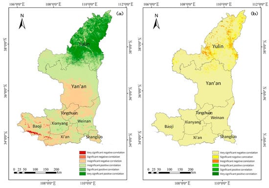 Note: The critical values of the correlation coefficients were r = 0.444 at the 0.05 level of significance and r = 0.561 at the 0.01 level of significance. The study area was categorized into six cases, i.e., highly significant negative correlation (r < −0.561), significant negative correlation (−0.561 < r < −0.444), insignificant negative correlation (−0.444 < r < 0), insignificant positive correlation (0 < r < 0.444), significant positive correlation (0.444 < r < 0.561), and highly significant positive correlation (r > 0.561).