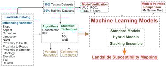- Liang, Z.; Peng, W.; Liu, W.; Huang, H.; Huang, J.; Lou, K.; Liu, G.; Jiang, K. Exploration and Comparison of the Effect of Conventional and Advanced Modeling Algorithms on Landslide Susceptibility Prediction: A Case Study from Yadong Country, Tibet. Appl. Sci. 2023, 13, 7276. [Google Scholar] [CrossRef]