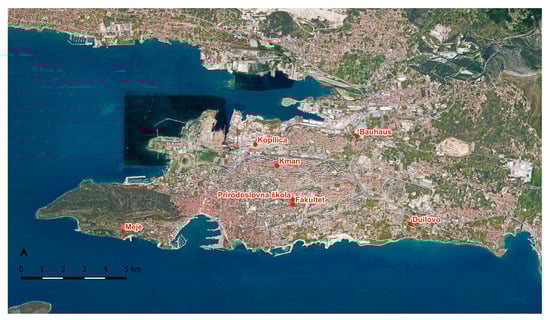 - URL 2: Visit Split. Available online: https://visitsplit.com/hr/1232/polozaj (accessed on 12 September 2024).