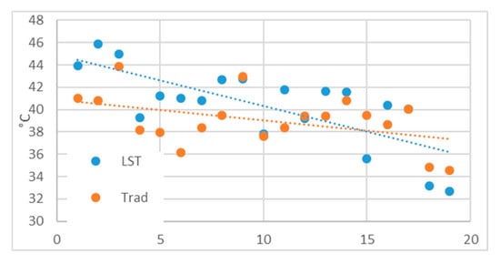 Measured ground temperatures at three measurement sites were compared with the LST derived from processing satellite images for validation purposes. The linear trend between measured temperatures and computed LST is displayed in Figure 3. Both have a negative trend, which coincides with the passage of summer and the decrease in temperature. Perhaps as a result of a greater reliance on surface properties, LST exhibits a quicker decline. With a correlation coefficient of 0.76 between the measured and computed data, it is evident that these two variables have a strong positive linear relationship and are influenced by similar factors.