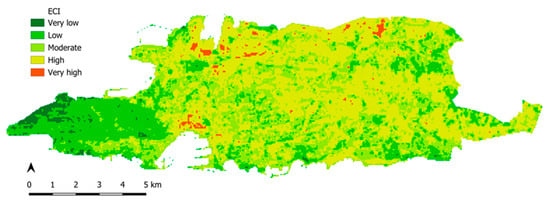 Every neighborhood where field measurements were conducted or where measuring stations were situated, including Brda, Kman, Meje, Neslanovac, Split 3, Žnjan, and Varoš, was examined. The ECI was calculated for the area of a particular neighborhood, the value of which, according to Ranagalage et al. [], was divided into 5 classes: very low (≤0.5), low (0.5–1), moderate (1–1.5), high (1.5–2), and very high (ECI > 2). The raster of each neighborhood was then reclassified, giving each pixel a value between 1 and 5 in relation to the prior classification. For example, pixels classified as very low were given a value of 1, while pixels classified as very high were given a value of 5. After that, the average pixel value for the whole neighborhood was determined and added to the formula for the Combined Thermal Index (CTI) as ECIclass.